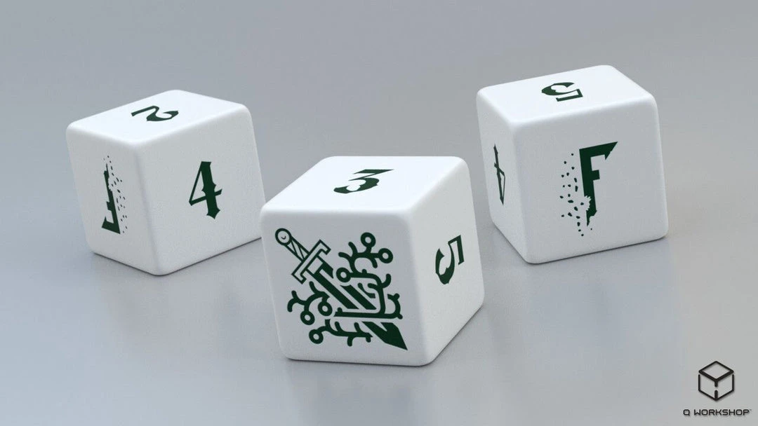 A set of custom 3 six sided die for the Fragged Kingdom RPG.