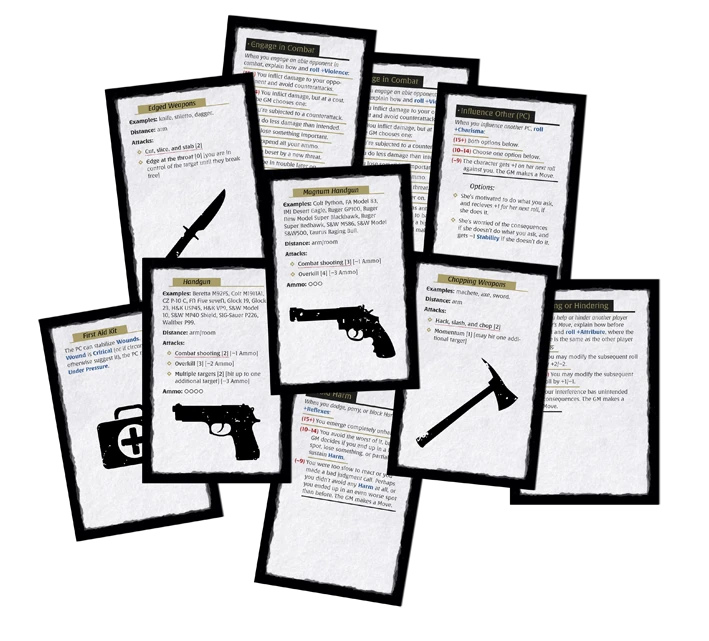 The weapon cards show the complete profile of every firearm or close combat attack in the game, eliminating the need to reference the Core Rules. The Basic Moves cards present how and when the Moves are used, and show the potential outcomes of rolling the dice.
