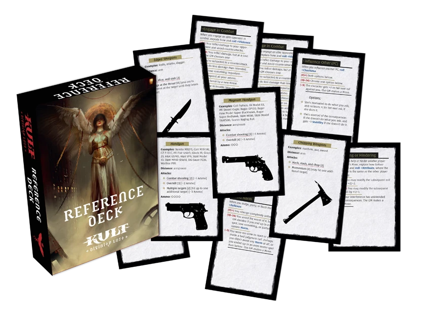 The Reference Deck for KULT: Divinity Lost consists of 55 cards, detailing weaponry, gear, and the Basic Moves, in multiple copies.